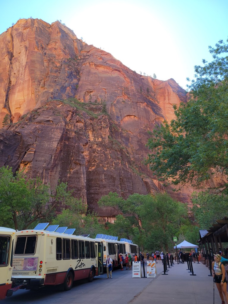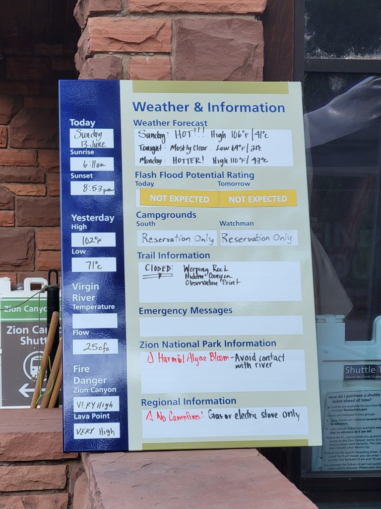 My fears were not necessary, however. Because of the time change between Valley of Fire and Zion not being in our favor, we arrived at Zion at 2:30 pm. This actually worked out well, since many people left in the afternoon due to the heat – we had many spots in the Visitors Center lot to choose from. By the time we visited the bathrooms, refilled water, scoped out the Visitors Center area, and such, there was a park system shuttle waiting for riders (no line!). We hopped on (masks required), and rode all the way out to the Temple of Sinawava. We wanted to do the Riverside Walk (2.2 mile) trail to the beginning of the Narrows. Most of the other stops were actually closed due to large rockfalls, so this was one of the only hikes that we had on our list that was still open.