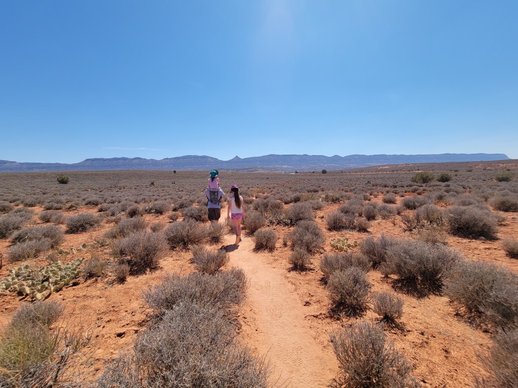 We were following the trail very well, and saw some nice desert views, if you’re into that kind of thing (my family was not). Eventually we came to a marker that marked the rim trail going to the right and the slots were to the left. I went to the left of the sign and continued on the path. After going about a mile, we realized we must have missed a turn, as we were still up on the rim. Unfortunately, I didn’t know where we went wrong, so we turned around. At this point, Wormy (after having declared “I hate the desert” a half mile in) is crying. I was pretty sure that was only going to make her feel more dehydrated (don’t worry; we brought the camelback with us).