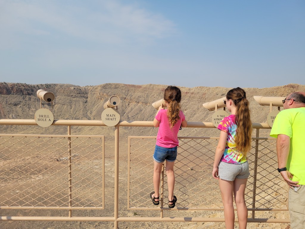 When you enter the crater area, there is a visitors center where you show the tickets you bought online (they are cheaper), or you can purchase tickets in person. We bought mine and the girls’ online, so we just had to show our phone to enter. Hubby had to buy his onsite because he has a military I.D. Once you get past the entrance, you have your choice of watching a short video that was show on the hour, going out to look at the crater, wandering around to look at exhibits, or watching a 4-D adventure space mission. It wasn’t time for the video, so we decided to check out the exhibits. I got to touch the biggest remaining meteorite fragment from the meteor impact.