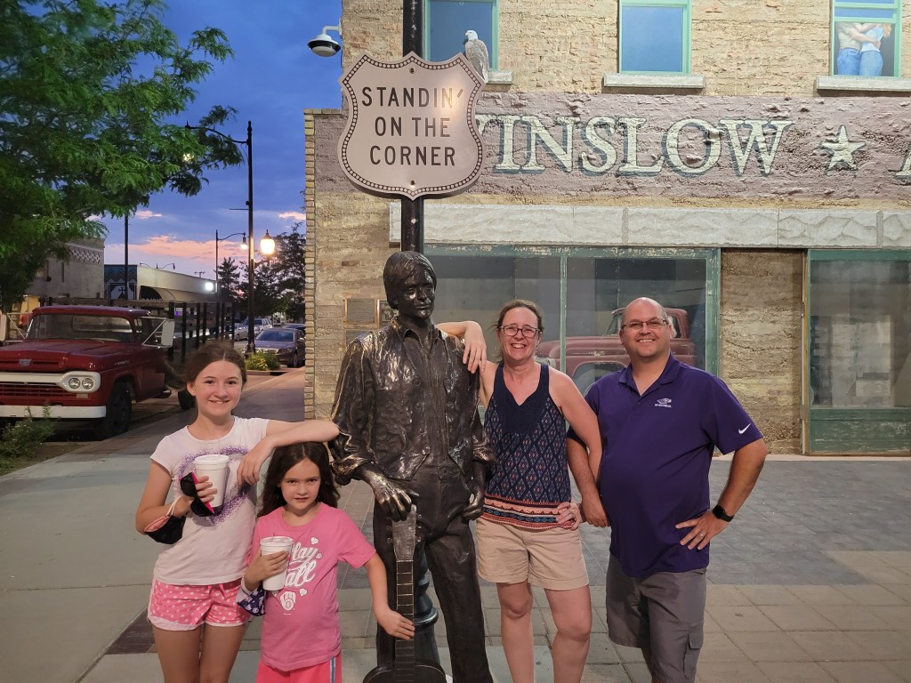 After leaving Holbrook, we went in search of dinner in Winslow (another Route 66 town). We had fun “standin’ on the corner in Winslow, Arizona” like in the Eagles song “Take It Easy.” They even had a corner set up to take pictures on.