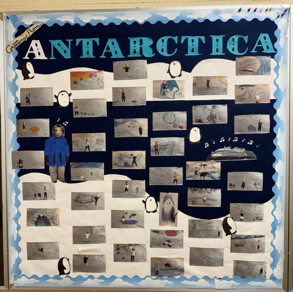 After the students drew their ideas, I took their pictures looking like explorers in front of a green screen. I then put the student pictures into their drawings and turned my bulletin board into a collection of their images, as though they were postcards from Antarctica. I put it up right before I left, so students would be able to look at these images the entire time I was on my expedition.