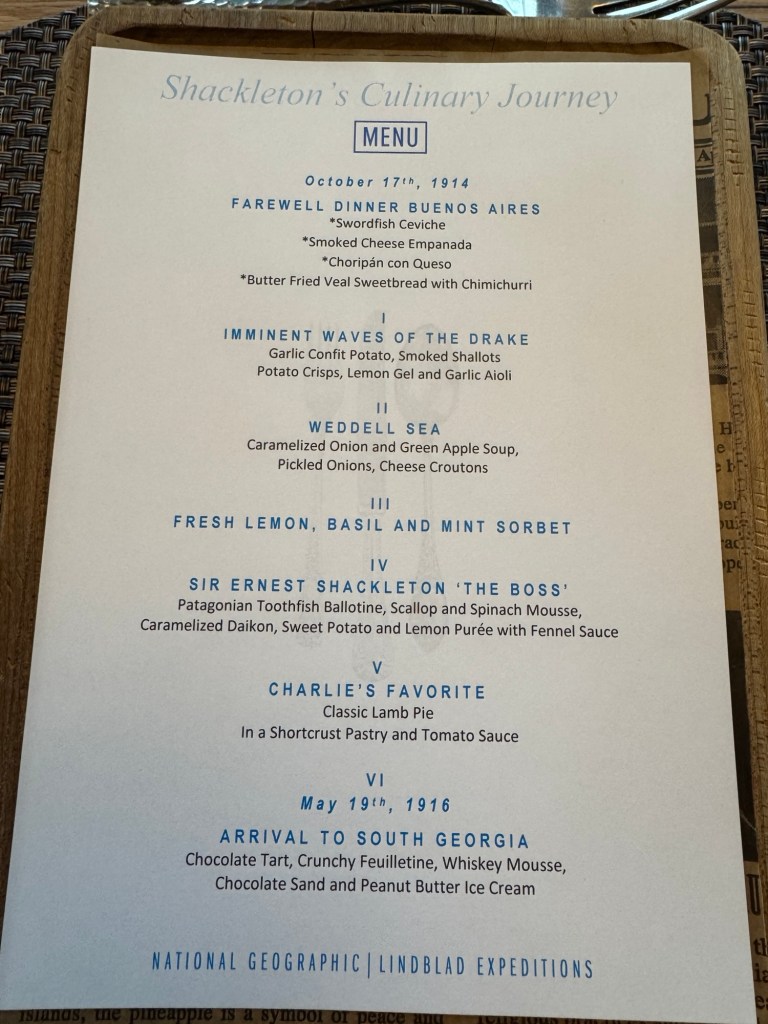 My roommate and I were invited to the special dinner tonight (all guests get this experience, but we are divided into small groups for each night). The menu was a culinary tour of explorer Shackleton’s expedition to Antarctica. It was so delicious and such a fun event.