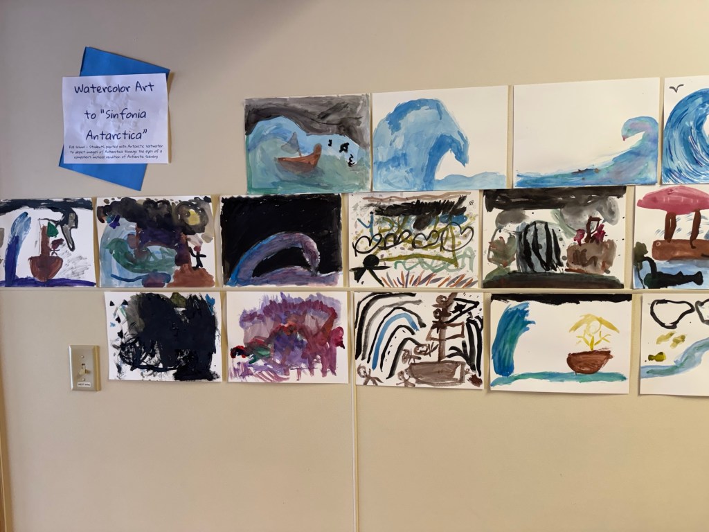 Students listened to Ralph Vaughn Williams’s piece, and created a painting to match what they heard through his music. Before we listened to the recording, we looked at famous artwork that was influenced by the water – such as Claude Monet’s “Impression: Sunrise,” Katsushika Hokusai’s “The Great Wave Off Kanagawa,” and Georgia O’Keefe’s “Blue Wave Maine,” among others. Students were then inspired to make their own art while listening to “Sinfonia Antarctica.” I was impressed by how many students heard moments that made them think of giant waves, shipwrecks, and other dark moments on that water.