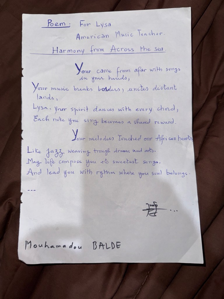 This artist used his gifts to create an original piece of artwork for each of us!This music class met on a day it wouldn’t normally, with a teacher who came in special just to show me what music looks like in Senegal schools (because my school placement did not have music). The teacher isn’t even their music teacher – he is the president of the country’s music teacher association, and he ran class with these students he didn’t know just for me!