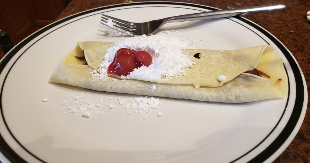 I left detailed instructions for Squid, and the girls became the waitstaff. We had sparkling cider for our beverage, and then the girls served us our appetizer. While we ate that, they finished mixing up their mac & cheese and brought it downstairs. They came up and served us our main course, then went back downstairs to eat. Of course, this is the first time EVER they ate their meal quickly, but they were excited, so I didn’t complain. Squid serenaded us with live piano music while Wormy cleared the table. They then brought us our desserts and went downstairs to clean up their dishes.